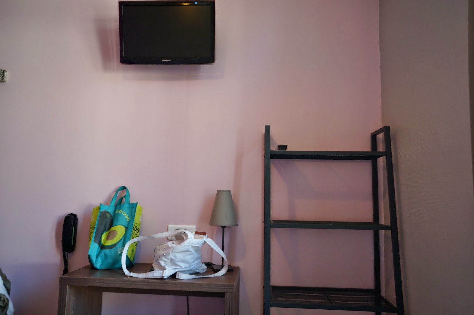 We had a tiny television, mounted on the wall, hospital-style, and a small desk (no chair) and a little bookshelf. It's just the basics here, but that's fine. I didn't snap a photo of the bathroom but just picture a 4 x 4 grid, one square is occupied by a stand-in shower, the second is occupied by the toilet, and the third holds the sink. The fourth square is just enough space for the door to swing in and that's it. We couldn't even keep our toiletries in the bathroom because it was so teeny!