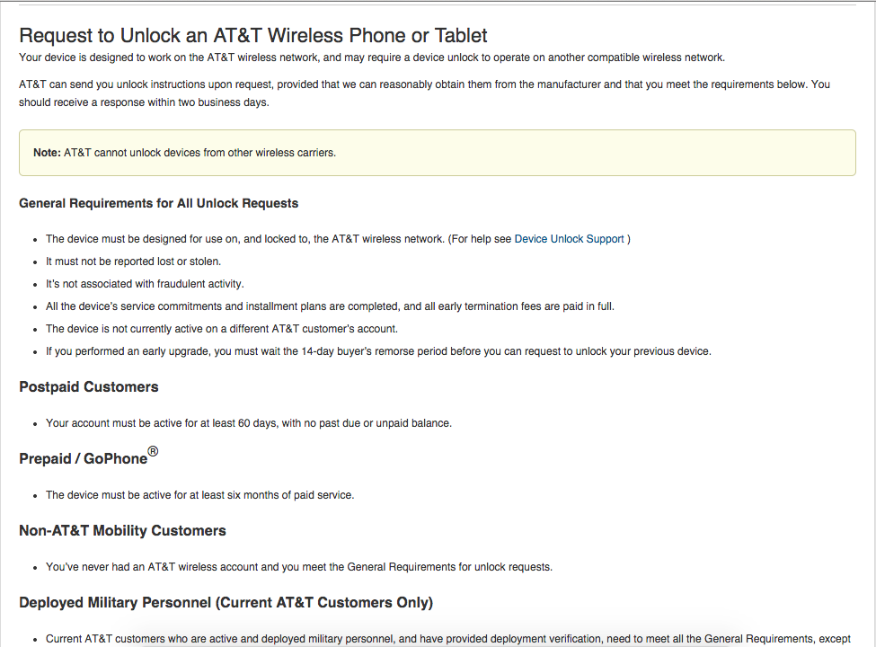 The caveats? Well, you have to be up to date with your payments (as a current customer) and the phone has to be out of contract (basically, an old phone that you tossed in a drawer after you got a brand new phone) or you've terminated your contract and are no longer tied to that mobile phone company. Or, if your contract is current but you were active in the military and being deployed abroad, they have to help you out. Or, if you were never an AT&T customer but you bought an AT&T phone from someone, they have to help you out.