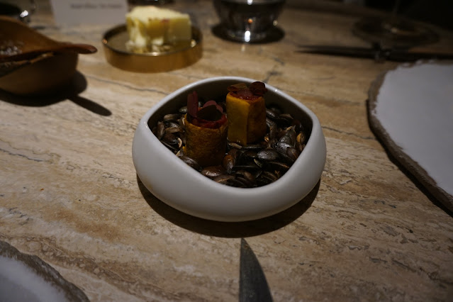 Because we're us, we opted to upgrade our tasting menu to include white truffles. For our amuse, we got these delicious little gougeres, crispy shrimp, and escargot. The escargot was so delicious. Then we were given a mochi and these super long breadsticks. We had a scallop course, which included a broth, a preparation with buffalo mozzarella, and then a scallop sitting in a squid ink sauce, and finally a clam. The next course had a beef consomme, oyster, more buffalo mozzarella, pork, and uni. We had a xiao long bao. There was brioche, a pot of clams from Brittany. We had lobster with truffle and king crab. We had shrimp ravioli with crispy kale. We had eel. There was an amazing lamb served with a vol au vent and pomme puree. And then the dessert course had multiple levels, including a plum sorbet and lemon custard, an apple tart, hazelnut pastry, cannolo, chocolate truffle, and then J got some birthday macarons. It was an amazing meal, made even more enjoyable with a trip to the kitchen to give our thanks to the chefs. Also, sat near us during dinner was a couple that ended up getting into a fight! The lady ended up leaving early and then the staff came to tell the man that they could prorate his meal. We were loving the drama and so curious about what happened.